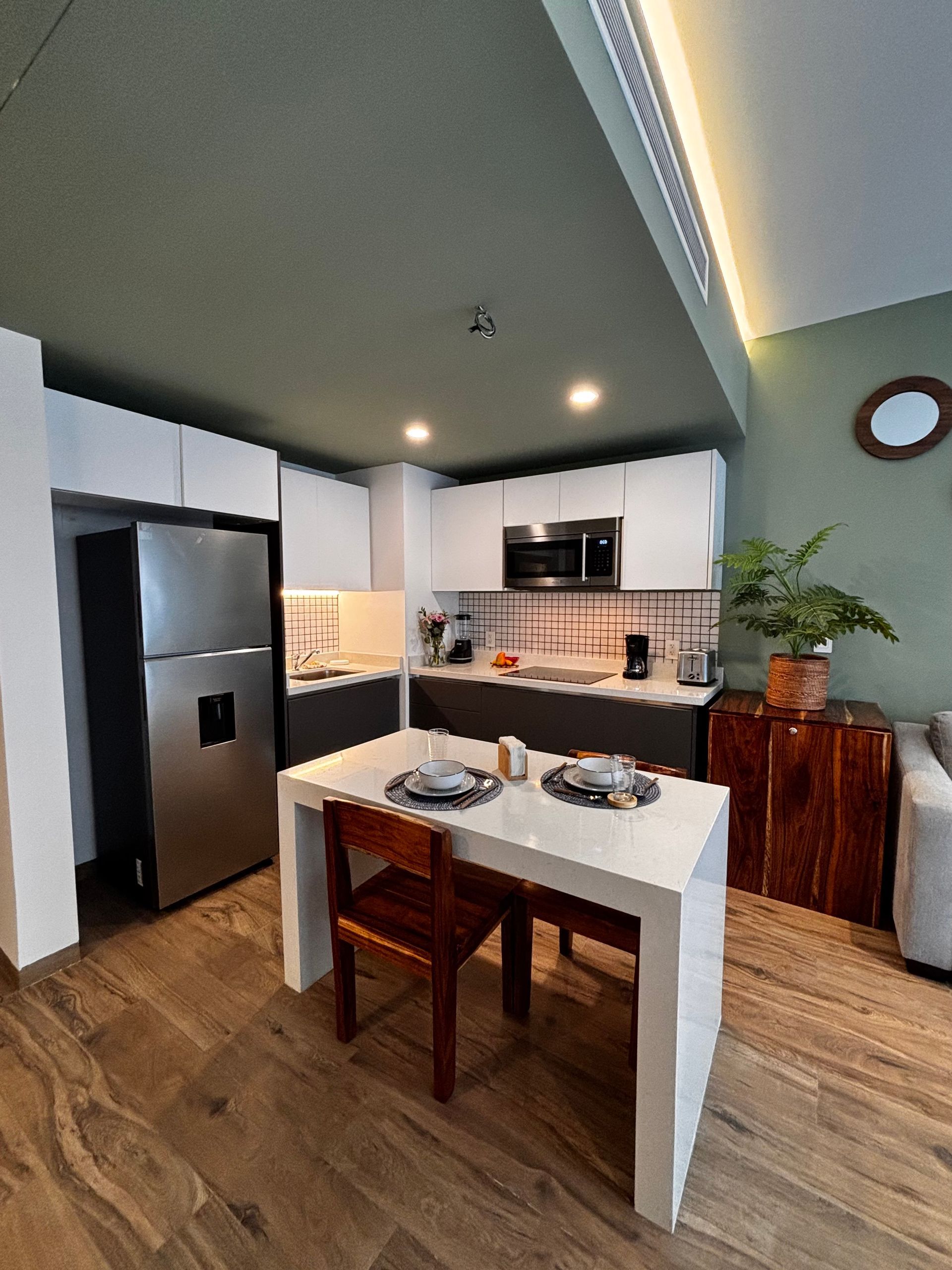 Cuenta con cocina, cama king Size, sofá-cama, TV, Aire Acondicionado, Gym, sala de trabajo ( coworking), alberca en terraza y 2 piscinas más pequeñas en planta baja, recepción, estacionamiento y vigilancia.